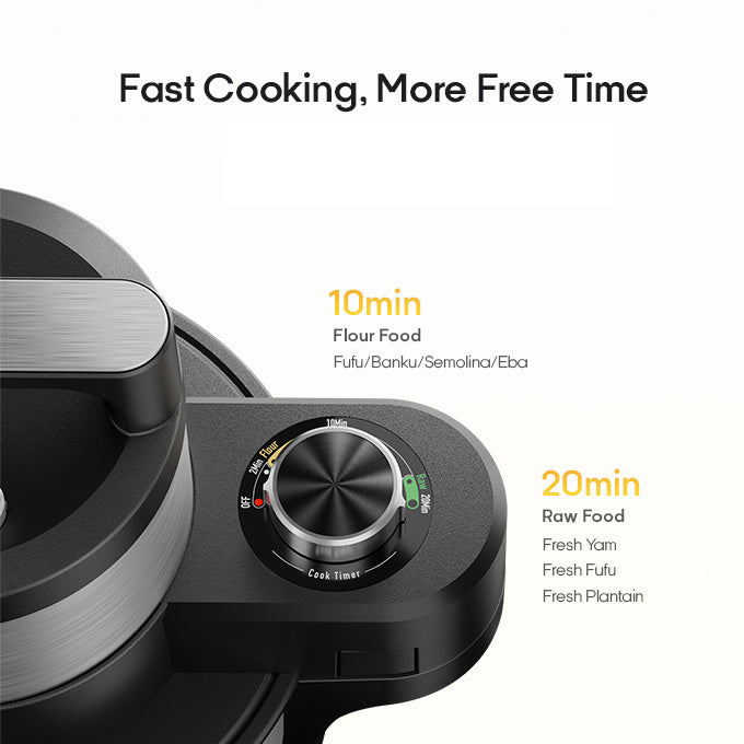 - Time is precious, and Swallow Maker Eco saves it. Featuring powerful 900W heating with 1000W stirring power, the Eco ensures fast cooking, significantly reducing the time spent in the kitchen. Enjoy consistent, perfectly textured swallow (fufu, Konkonte, Akple, etc.), making your everyday meal preparation quick, effortless, and enjoyable.